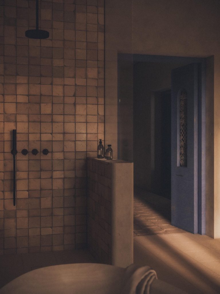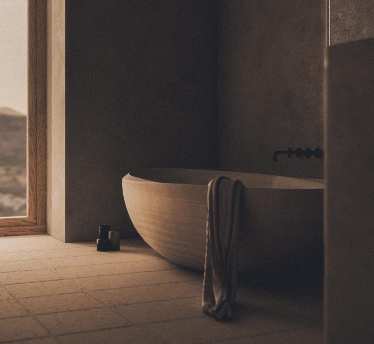 Warm light falls over a freestanding stone tub, the room breathin calm.